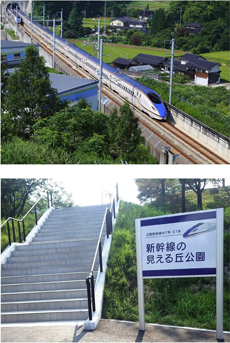 新幹線の見える丘公園は、町の中心部から東へ約3km離れた、新幹線高架橋に隣接する工業団地の中にあります。平成27年3月14日の北陸新幹線金沢開業に合わせて再整備し、町の内外から観光客が訪れる人気スポットのひとつです。展望広場にある案内看板には、北陸新幹線の通過予定時刻を掲載しております。ぜひ一度足をお運びいただき、高台からの景色の魅力を感じていただければ幸いです。